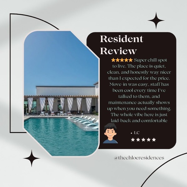 You’ll feel right at home at The Chloe, an exceptional collection of one- and two-bedroom apartments in Kyle, TX. Modern, relaxing interiors. Club-quality amenities. Curated living experiences. Our unbeatable location in the Dry River District of Hays County gives our residents walkable convenience and easy access to buzzing nightlife, mouthwatering dining options, and exceptional retail. And all this against the backdrop and natural beauty of Texas Hill Country. So embrace the lifestyle you deserve! Enjoy being home. Reserve your apartment at The Chloe.